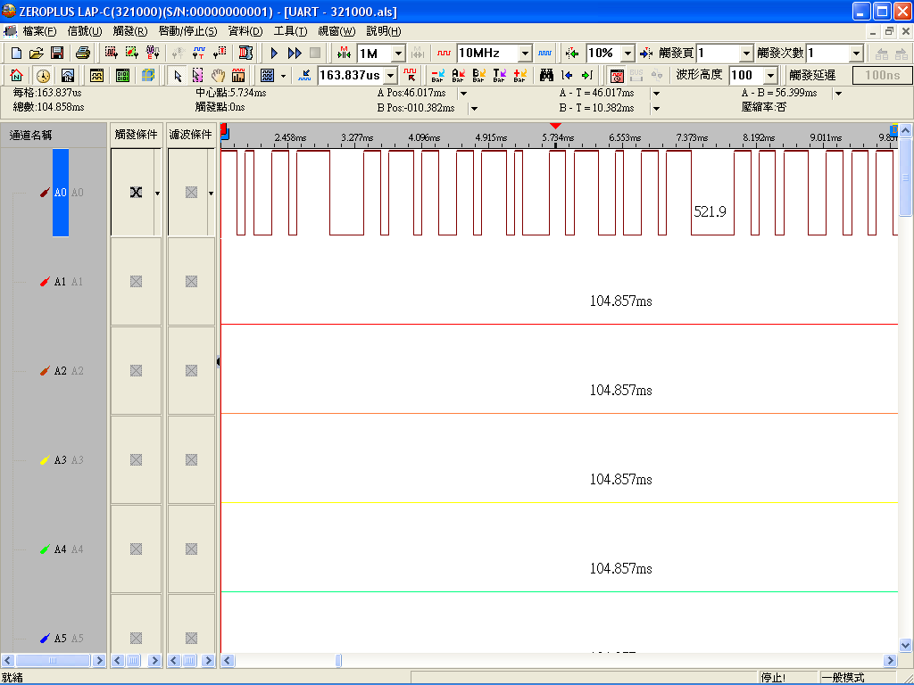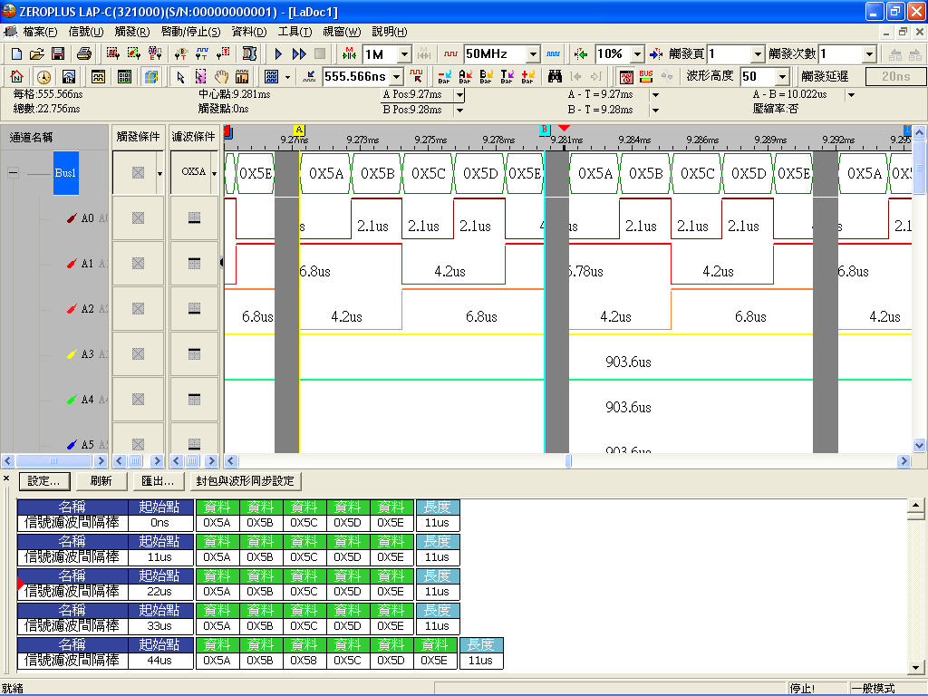 依照安装手册第三章所述,进行逻辑分析仪设定,设定完成后启动逻辑分析仪软件及送出待测物讯号进行撷取,撷取完成如图所示。 提示:逻辑分析仪取样率需高过待测目标频率四倍以上才能确保讯号正确。 |