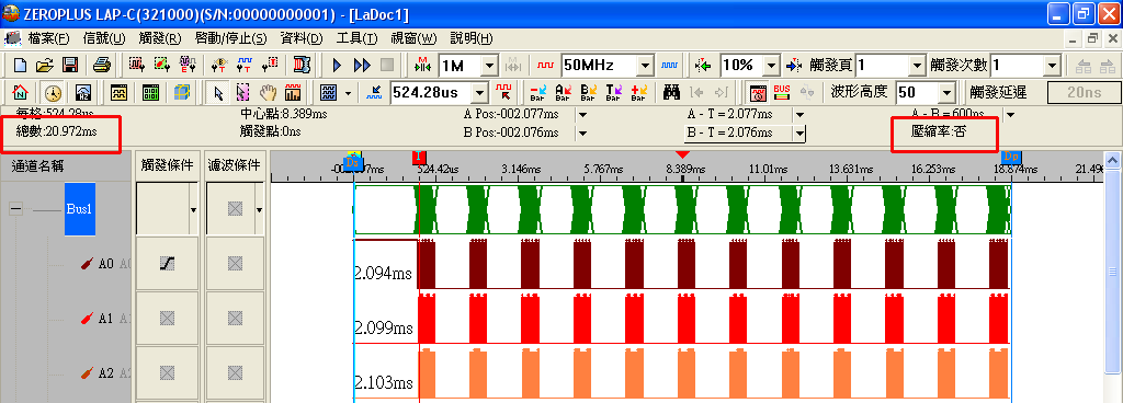 孕龙科技推出波行压缩zhuan利技术,可以在不增加内存的状况下获取更长的波形资料。For Example:设定内存深度为1M,取样率为50MHz。未开启压缩功能时仅可撷取20.972ms,若开启压缩功能后,以同样记忆深度为1M,取样率为50MHz进行取样,则可以将波形时间增加至3.999s,大大的提升了撷取数据量。 |