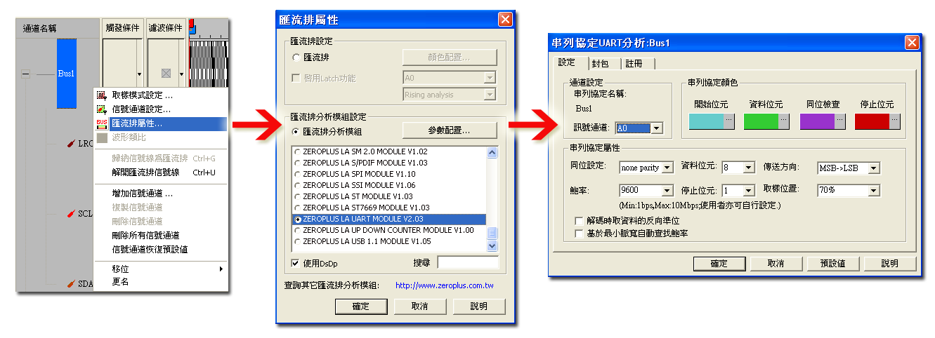 在新增的总线上点选鼠标右键,选择总线属性,再选择要使用的总线分析模块,每一种总线分析模块均有相对应的参数设定,使用者可在参数设定中依照待测总线内容加以设定。 提示:孕龙逻辑分析仪SPI总线分析模块可同时分析SPI中的MOSI及MISO,使用时仅需设定两组SPI总线分析模块即可。 |