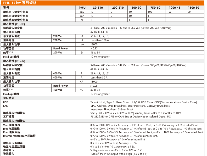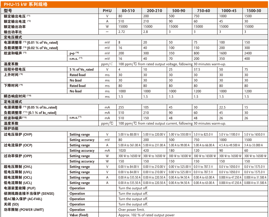 共有18 种型号,包括3种功率容量(5kW/10kW/15kW)和6种电压(80V/200V/500V/750V/1000V/1500V),以满足所有客户的需求。