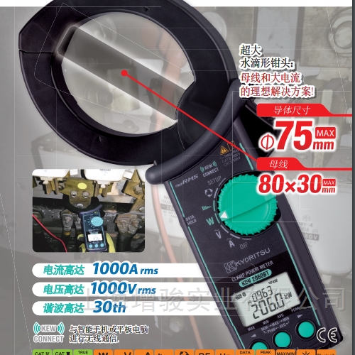 KEW 2060BT与智能手机或平板电脑,进行无线通信.超大水滴形钳头:母线和大电流的理想解决方案。测理电压, 电流, 频率, 有功功率, 无功功率,视在功率, 功率因数(cosθ), 相位角,