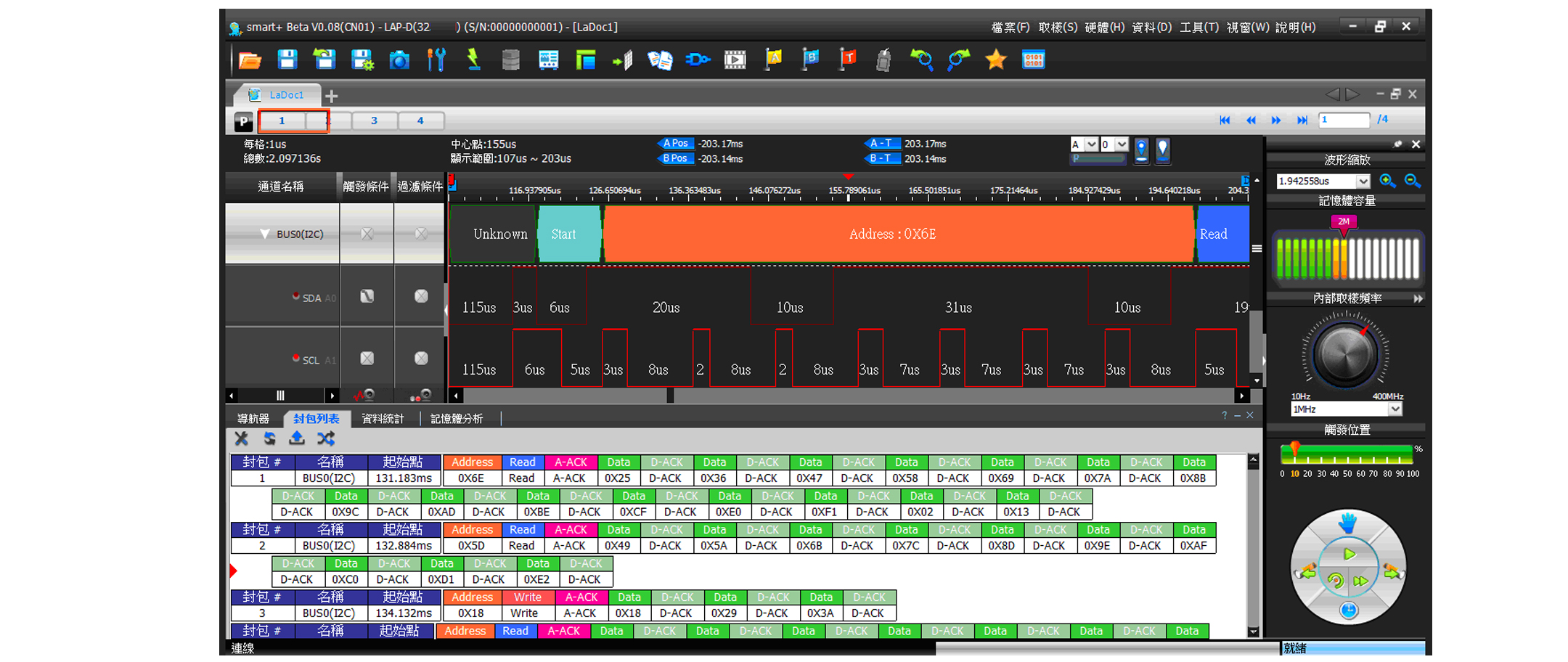 依照快速安装手册第三章所述,进行逻辑分析仪设定,设定完成后启动逻辑分析仪软件及送出待测物讯号进行撷取,撷取完成如图所示。