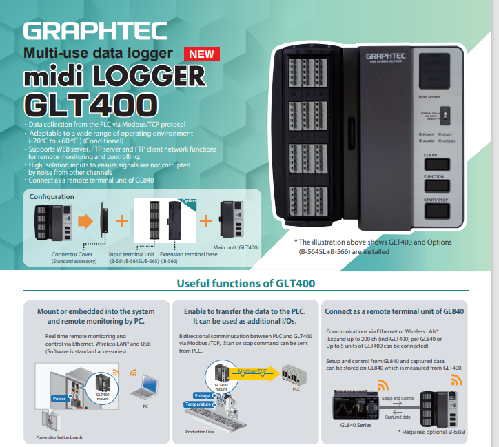 日本GRAPHTEC全新推出GLT400 无线数据记录仪通过Modbus/TCP协议从PLC通讯实时记录数据。支持WEB服务器、FTP服务器和FTP客户端网络功能用于远程监控。GLT400 还可以在超低温环境下使用。