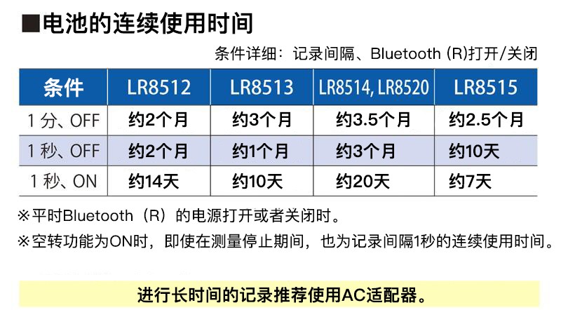 连续使用时间 | 约2.5个月(记录间隔1分钟,Bluetooth® OFF) 约7天(记录间隔1秒, Bluetooth® ON) 约2天(记录间隔0.1秒,使用LR8410-30或LR8410-30特制品实时测量时) |
