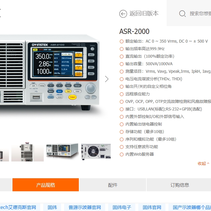提供用户波形输出功能,包括1)Sequence mode可以产生波形下降,浪涌,凹陷,变化和其他异常电力线条件,2)Arbitrary waveform function可供使用者储存/加载使用者自定义的波形,3)Simulation mode仿真电源中断、电压增加、减少及频率变动。ASR-2000 series电源输出时,同时也可以量测待测物的Vrms, Vavg, Vpeak, Irms, Iavg, Ipeak, IpkH, P, S, Q, PF, CF, 40阶Voltage Harmonic 和Current Harmonic。除此之外,Remote sensing功能确保准确的电压输出,Customized Phase Angle for Output On/Off功能可以依据测试需求,设定电压输出的起始角度与结束角度。V-Limit, Ipeak-Limit, F-Limit, OVP, OCP, OPP功能设定可以在量测过程中,保护待测物。OTP、OCP、OPP保护,Fan fail alarm功能及交流输入电压过低侦测功能。