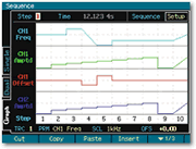 ![]() | 左图所示信号看似非常复杂,但获取该信号仅需下图表所示的简单程序(序列清单), 其事后操作就由WF1973/ WF1974自动进行。 如果使用附件“序列编辑软件”, 就能轻易地制作·编辑复杂的程序。 |
