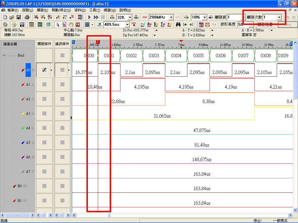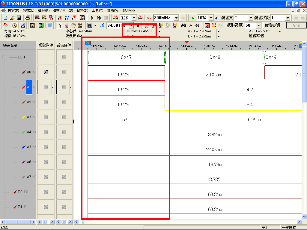 依照安装手册第三章所述,进行逻辑分析仪设定,设定完成后启动逻辑分析仪软件及送出待测物讯号进行撷取,撷取完成如图所示。 提示:逻辑分析仪取样率需高过待测目标频率四倍以上才能确保讯号正确。 |