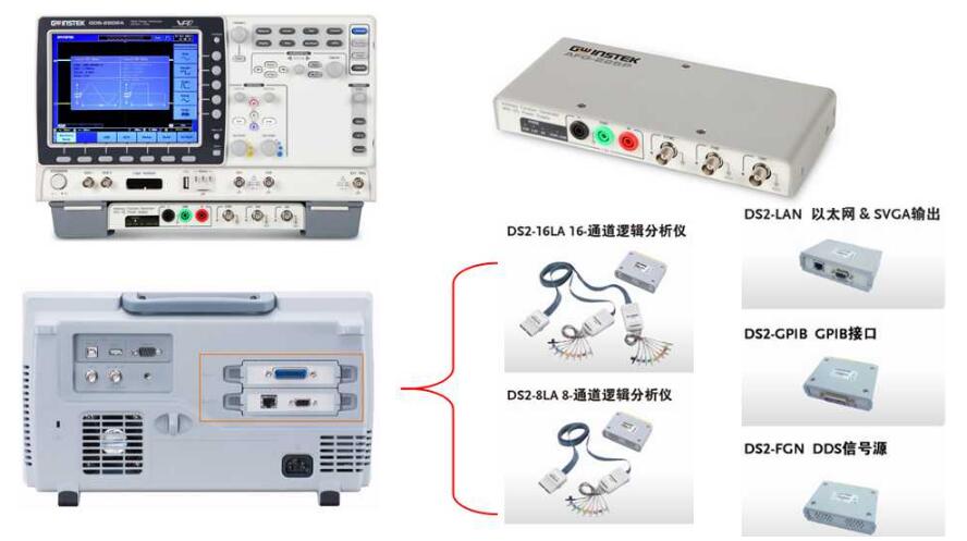 选配的逻辑分析仪通过逻辑触发捕获信号,使逻辑波形和模拟波形显示在同一个屏幕上,方便比较和时间分析。在后面板插入8/16输入通道模组,实现混合信号示波器(MSO)功能。GDS-2000A系列具备如今所有DSO应有的性能特点。标配的RS-232C接口、USB接口和Go-NoGo输出,以及选配的以太网接口、SVGA视频输出接口和USB-GPIB转接头,供用户自行选择。可选配信号源模块,适中的价格,创新的设计,GDS-2000A具有很高的客户价值。