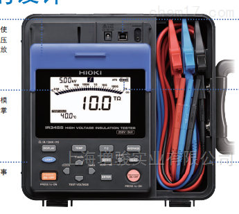 功能 | 绝缘判断功能(温度补偿,PI/DAR显示,步进电压试验),数据存储,通讯 (USB 2.0, PC应用软件),自动放电,通电警告显示等 |